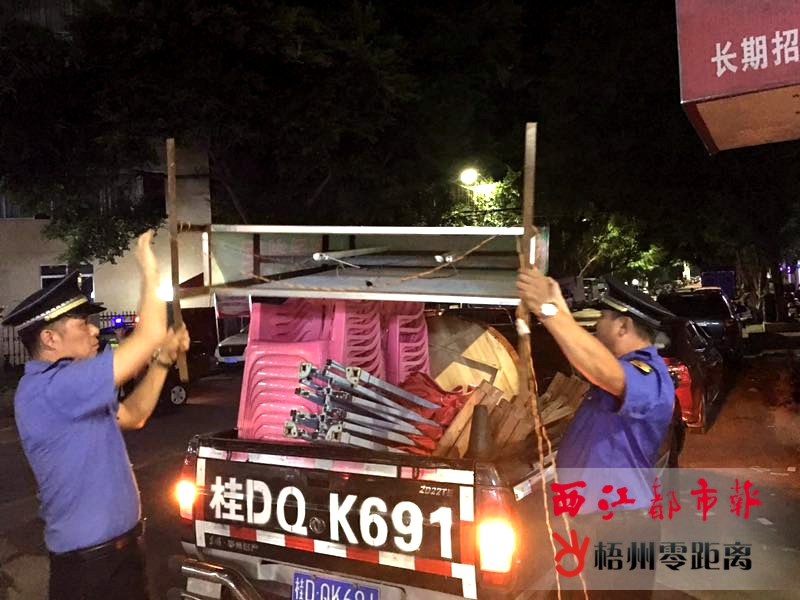 梧州零距離網(wǎng)-西江都市報(bào)訊(記者 吳艷虹 通訊員 黎海平)夏天的晚上,吃夜宵是梧州市民喜愛的消遣方式之一。為了使夜宵攤檔規(guī)范經(jīng)營(yíng),盡量減少對(duì)周邊居民、衛(wèi)生環(huán)境的影響,9月3日晚,萬秀區(qū)組織市場(chǎng)監(jiān)督、城管、交警、綜合警務(wù)等部門,組成聯(lián)合執(zhí)法隊(duì)伍,到下沖、廣東路口、龍山路、東山?jīng)_、怡景小游園和大中路等地,對(duì)餐飲店開展整治行動(dòng)。 當(dāng)晚,在廣東路口,一輛銷售牛雜、燒烤的流動(dòng)餐車正在路邊占道擺賣,車旁擺放著幾套桌椅供食客使用,總體占地面積約12平方米。檔主在昏暗的燈光下忙活著,燒烤過程中冒出的油煙直接排放到空氣中。市場(chǎng)監(jiān)督執(zhí)法人員經(jīng)檢查發(fā)現(xiàn),該攤檔沒有辦理營(yíng)業(yè)執(zhí)照等相關(guān)手續(xù),執(zhí)法人員隨即要求檔主盡快補(bǔ)辦,亮證亮照經(jīng)營(yíng)。同時(shí),由于檔主的行為已經(jīng)違反《梧州市城市市容和環(huán)境衛(wèi)生管理?xiàng)l例》第十七條“任何單位和個(gè)人未經(jīng)批準(zhǔn)不得占用城市道路、人行道、橋梁、人行天橋、地下通道、廣場(chǎng),以及其他公共場(chǎng)所從事設(shè)攤、兜售等經(jīng)營(yíng)活動(dòng)”,城管執(zhí)法人員對(duì)其作出處罰200元的決定,并責(zé)令其立即整改,停止經(jīng)營(yíng)。 隨后,執(zhí)法人員來到龍山路巡查,發(fā)現(xiàn)大部分夜宵攤檔都能在劃定的范圍內(nèi)規(guī)范經(jīng)營(yíng),衛(wèi)生情況有所改善。但在龍山路至西環(huán)路口處,一家名為“山某烤活魚店”的臨街店鋪,在店外臺(tái)階處擺設(shè)了8套桌椅,且桌子均是10人以上的大圓桌,還有一頂大帳篷,占地面積約25平方米。城管執(zhí)法人員當(dāng)場(chǎng)對(duì)這些占道物品進(jìn)行暫扣處理。