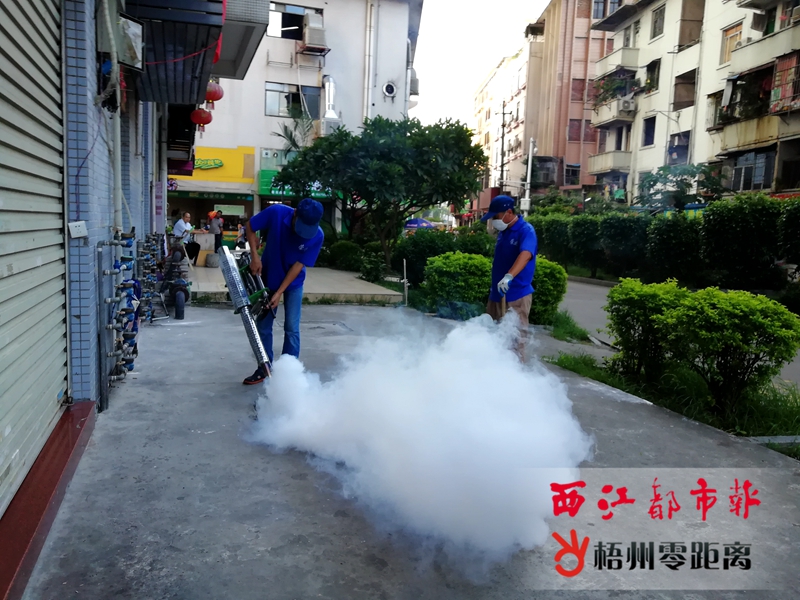 梧州零距離網-西江都市報訊(記者 朱元冬)日前,梧州市區出現了首例輸入性登革熱病例。對此,9月5日下午,梧州市疾病預防控制中心聯同長洲區衛健局、長洲區大塘街道辦、大塘社區衛生服務中心,到新興二路大塘公交車站附近一帶的居民樓進行滅蚊滅蟑的除害行動。