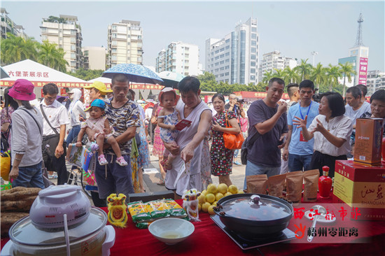 斗茶大會的裁判正在認真鑒賞茶葉。楊揚 攝 待評委們仔細觀察過茶葉后,沖泡后的六堡茶茶湯被倒在白色的器皿中。此時,茶湯的顏色或淺淡,或濃厚,不盡相同。圍觀的市民交頭接耳,通過茶湯評選自己心中品質好的六堡茶。有的市民認為,茶湯越濃越黑的六堡茶才是好茶。對此吳平表示,雖然六堡茶茶湯顏色以“紅、濃、醇、陳”為佳,但茶湯的紅,追求的是透亮的紅。此外,優質六堡茶茶湯的氣味也很重要,不能有任何的煙、焦、酸、臊、霉等雜亂的氣味。 集市有特產 展區展美食 會場里,斗茶區正“斗”得火熱,電商集市的100個特產推介展位也人氣爆棚。來自三城區、三縣一市的電商特色農副產品一一亮相,吸引市民爭相品嘗購買。