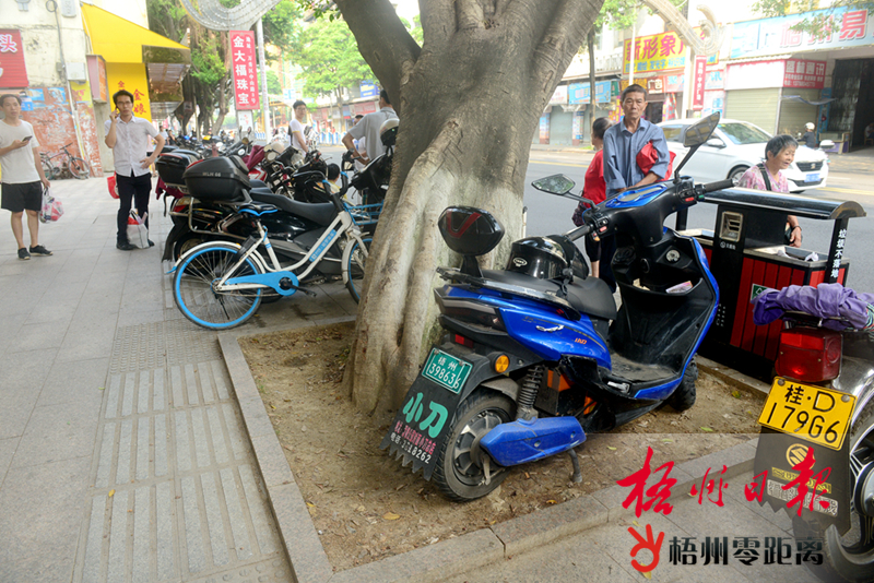 在西江二路,一些人粗暴地將助力車、三輪車等停在了樹(shù)底下的綠化帶上,對(duì)綠化帶造成極大的破壞。
