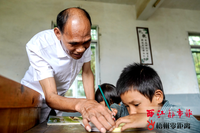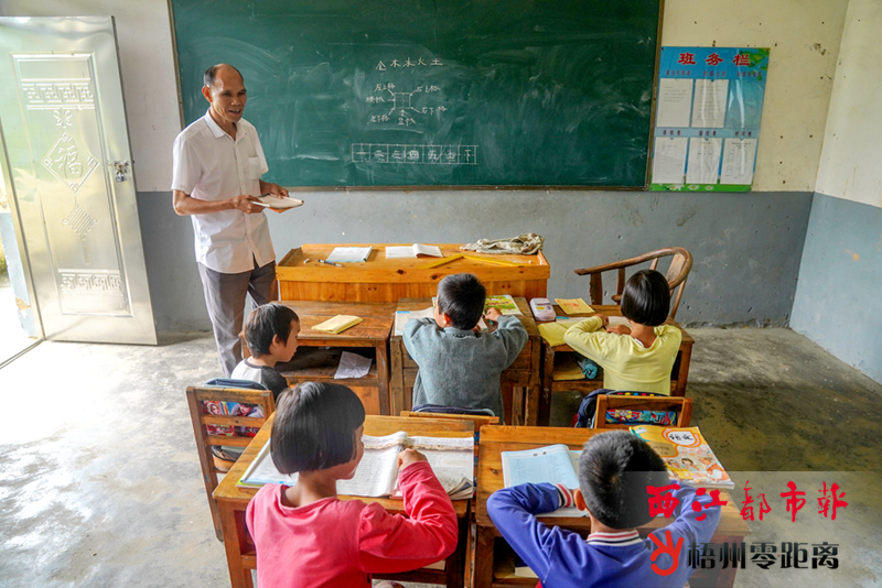 梧州零距離網-西江都市報記者 陳雨燕/ 文 楊揚/攝 “金木水火土、天地分上下、日月照金谷……”9月5日,岑溪市水汶鎮云會村云會小學二樓教室里傳出朗朗讀書聲。該校僅有的5名學生,在老師陳惠昌的帶領下,正捧著課本認真讀書。下課了,學生們奔向走廊看雨,陳惠昌則跟在后面,眼睛始終離不開他們。陳惠昌在云會小學任教了33年,對這里的一草一木、一磚一瓦,都飽含著感情,如今他即將要離開了,今天將是他給孩子們上的“最后一課”。