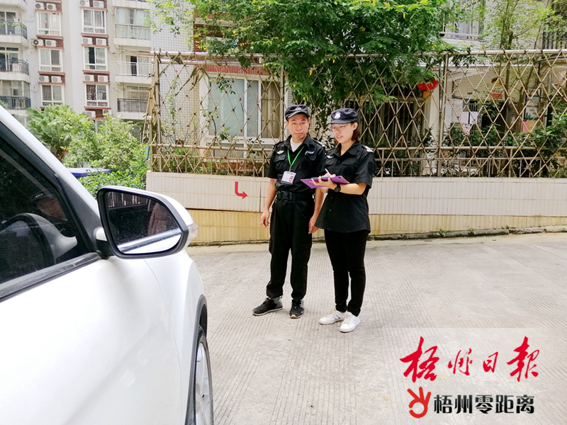 8月21日,記者(右)跟隨廣西德旺物業服務有限公司山水華庭服務中心的保安員潘錦雨抄錄停放在小區內車輛的車牌。 實習生 陳松泓 攝