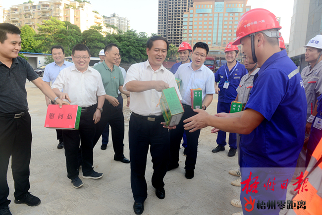 梧州零距離網-梧州日報訊(記者 曾韻)中秋佳節來臨之際,9月11日下午,市委書記全桂壽看望慰問堅守在施工一線的工人,對他們為城市建設發展所付出的辛勤努力表示衷心感謝和崇高敬意,并向他們送上節日的問候和慰問品。