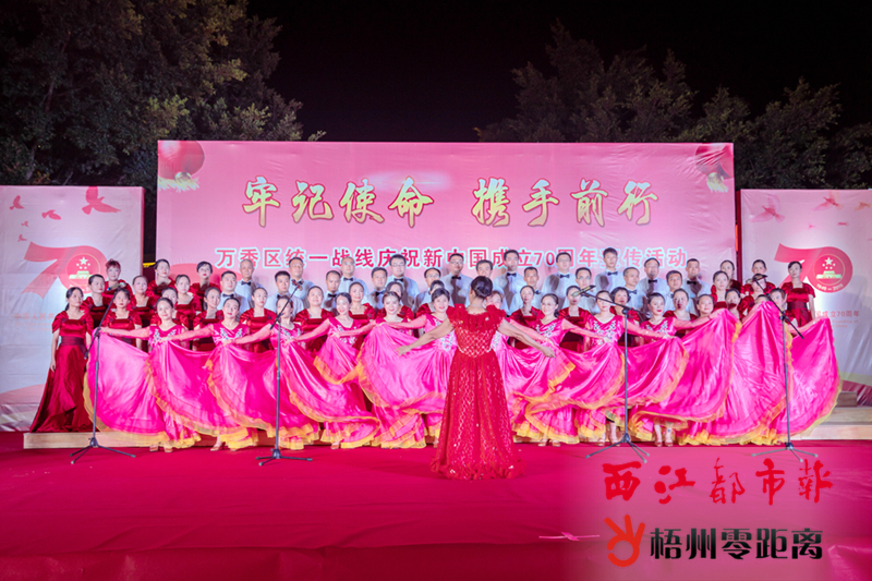 9月11日晚上,萬秀區委統戰部在潘塘公園廣場舉辦“牢記使命·攜手前行”萬秀區統一戰線慶祝新中國成立70周年宣傳活動。 今年是中華人民共和國成立70周年。近段時間,梧州市各行各業及文藝團隊陸續組織了多種形式的慶祝活動,既傳遞正能量,又豐富了群眾的文化生活。黎海平 攝