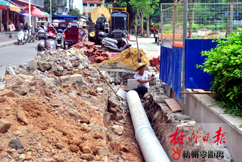 9月10日,在潘塘公園蓮花池西側(cè),施工人員正鋪設(shè)排污管道。