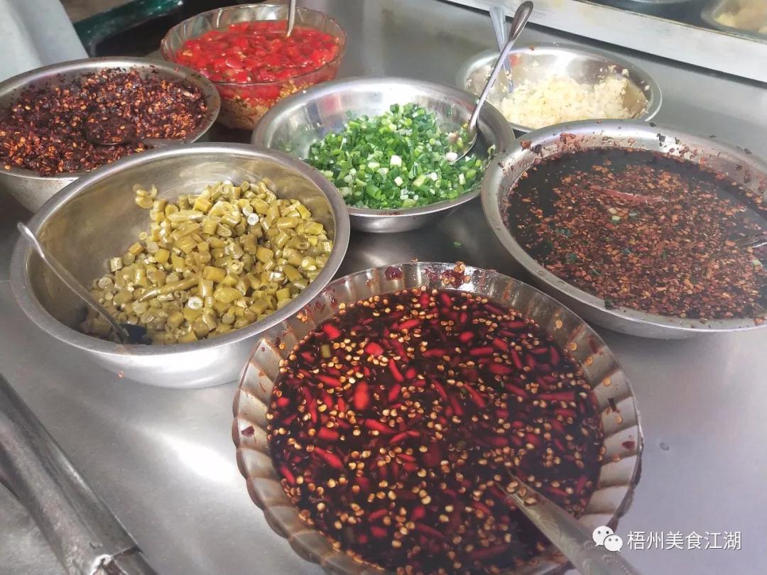 各種調料任君選擇 食客“妮妮姐姐”:這家的份量很足,一兩就像二兩似的。我建議少加點他們家的辣椒醬,這是老板娘親手做的,非常辣,按大多數梧州人的口味,吃不了那么辣,可以稍微加一點點,辣味能將米粉味道升華,畢竟正宗的味道還是要吃辣的。 食客“潛水妞”:這里的桂林米粉特別地道,無論是汁水還是配料,都與記憶中在桂林街道上吃的米粉一樣,我特別喜歡他們做的鍋燒肉,感覺特別香,脆脆的表皮加上甘香的油脂層吃起來簡直停不下來,再加上一勺辣椒油,簡直是我的最愛。