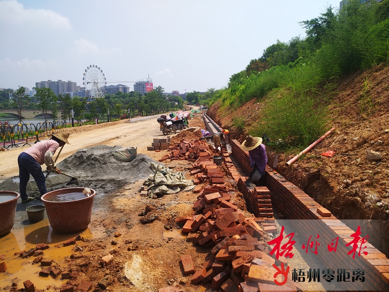 9月17日,在玫瑰湖公園東側(cè)道路,工人正在修筑排水渠。