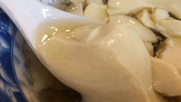 桂花糖豆腐花 阿鐘用大勺小心地舀起豆腐花,滑入青花瓷碗里,再倒入清澈的呈金黃色的桂花糖漿,份量還不小。吹彈可破的豆腐花可以在勺子上“Duang,Duang”地抖動。刺猬姐嘗了一口,口感并不甜膩,而且豆香濃郁、順滑。