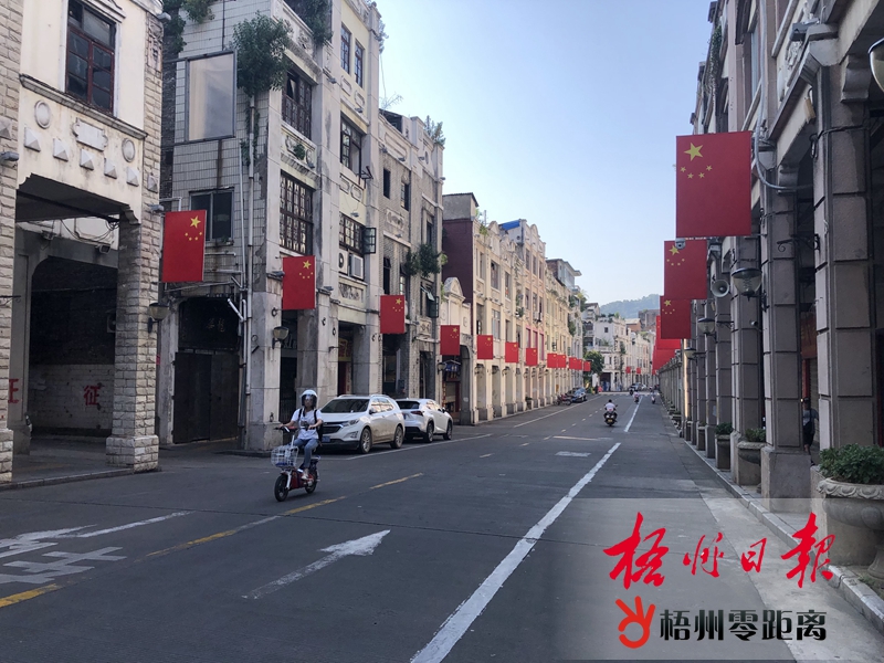 9月21日,萬秀區騎樓城一帶已經懸掛好五星紅旗。