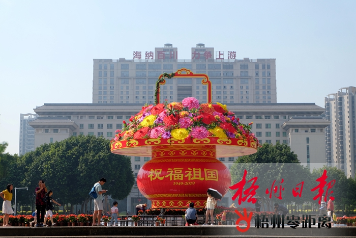 9月28日,市政廣場的“祝福祖國”花籃景觀造型布置工作進入尾聲,吸引眾多市民前來拍照留念。 梧州日報記者 何鎏 攝