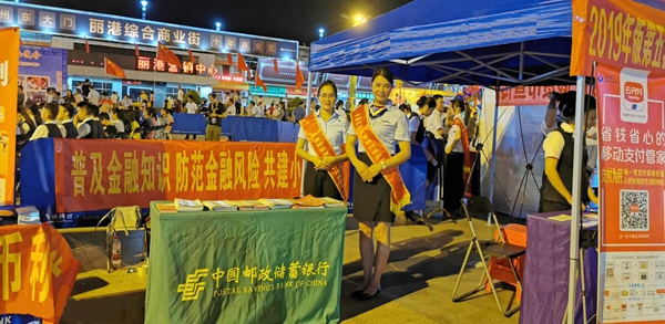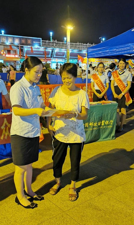 9月28日晚,人民銀行梧州中心支行在梧州市河東鴛江麗港廣場舉辦“不忘初心 牢記使命 梧州轄區銀行業金融機構開展慶祝新中國成立70周年暨反假貨幣宣傳活動”。郵儲銀行梧州市分行積極參與其中,結合本次宣傳主題,同步開展以“普及金融知識,防范金融風險,共建小康社會”為口號的宣傳活動,通過對過往群眾派發宣傳折頁的形式,緊緊圍繞人民幣知識、支付結算、儲蓄國債、外匯知識、反洗錢知識、防范非法集資等金融知識開展宣傳,并進行現場講解。