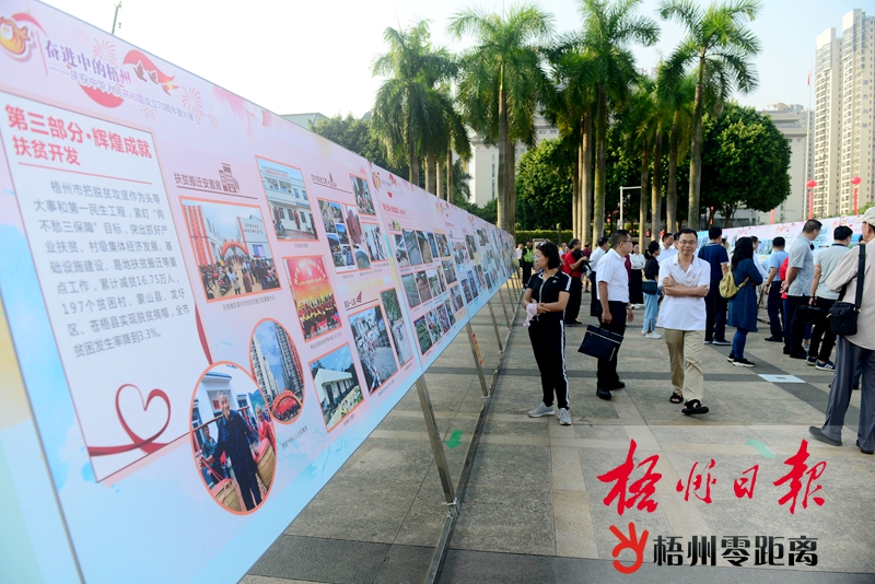 當天上午,“奮進中的梧州——慶祝中華人民共和國成立70周年圖片展”在市政廣場展出。此次圖片展分為建立政權、砥礪奮進、輝煌成就、和諧宜居四個部分,共展出圖片400多張,全面展示了中華人民共和國成立70年來,梧州在中國共產黨領導下取得的輝煌成就,展現了70年來梧州人民砥礪奮進、昂首前行的風雨歷程。圖片展現場吸引了不少市民群眾前來觀看,人們紛紛贊嘆70年來梧州市翻天覆地的變化。