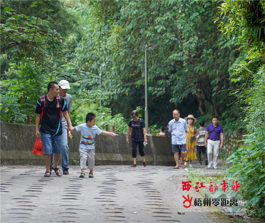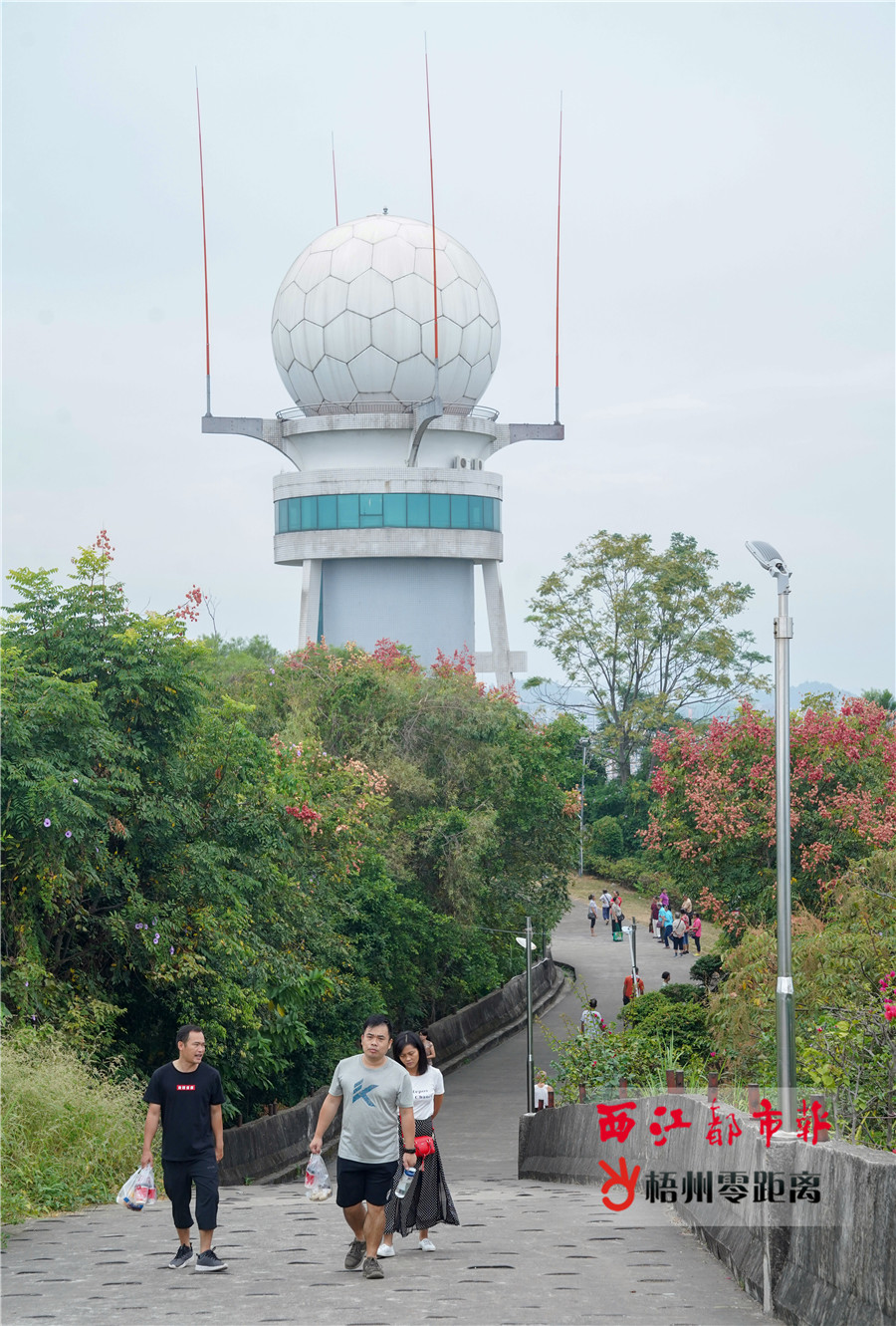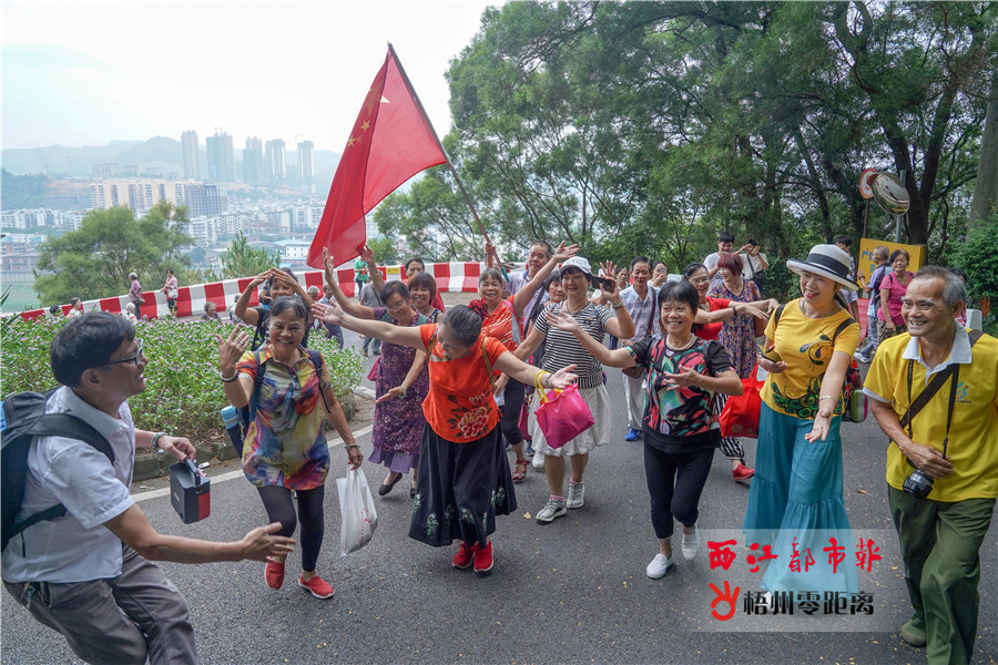 10月7日,市民在珠山公園鶴崗樓上登高望遠。 據悉,除了白云山景區外,重陽節當天,榜山公園、珠山公園等地,也引來了不少登高的市民游客。大家攜老帶幼,一起登高望遠,飽覽梧州風光。