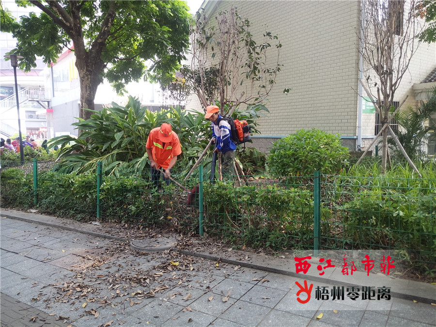 梧州零距離-西江都市報訊(記者 姚藍婷 通訊員 黎海平)進入秋季,梧州市內路邊及綠化帶內的落葉開始增多。為進一步清掃衛生死角、改善環境衛生,近日,萬秀區環衛站組織環衛工人加緊對綠化帶內枯枝落葉進行清理,并用上“神器”——環衛專用吹風鼓風機,提高工作效率。