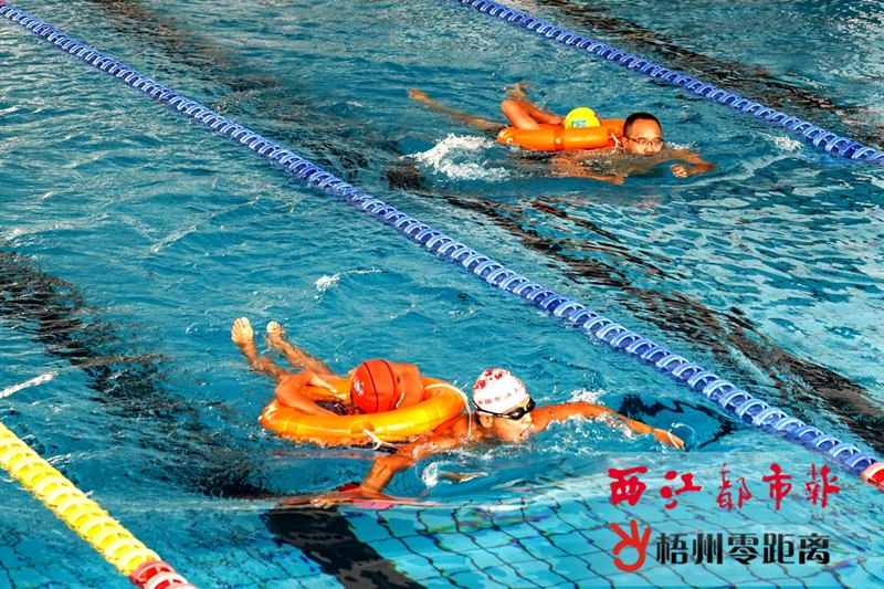 梧州零距離-西江都市報訊(記者 鄧發浩 通訊員 唐志洲)雖然金秋已至,天氣轉涼,但是市民的游泳熱情依舊高漲。10月13日,慶祝新中國成立70周年·梧州市市民運動會冬泳技能挑戰賽在梧州市游泳跳水館打響,60多名游泳愛好者齊聚一堂,切磋交流水中營救技巧。 據了解,本次比賽由梧州市文化廣電體育和旅游局、梧州市富民投資開發有限公司主辦。除了比拼速度的50米自由泳項目外,還設有緊急營救、臥墊刨泳等比賽項目,更全面地考驗選手的游泳技能。 當天上午,梧州市游泳跳水館水花四濺,活力四射,在場參賽的大部分都是擁有10年以上游泳經驗的游泳愛好者。當比賽進入到緊急營救項目時,現場氛圍更顯緊張刺激。該項目需要一男一女組合進行,其中一名選手需要在泳池內扮演“受困人員”,另一名選手則需要持救生圈前往營救。而臥墊刨泳項目的比賽氣氛則相對輕松,選手需要臥在泳圈上劃行前進,過程不能掉下水。