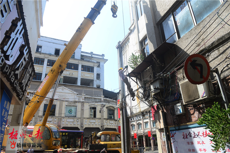 10月18日,工人正在拆除南環(huán)路臨街一帶的廣告牌。據(jù)了解,近日,萬秀區(qū)組織施工隊伍,陸續(xù)對南環(huán)路、大中路等主要路段臨街商鋪陳舊破損的廣告招牌以及居民樓上的遮雨棚、臨時搭建物等進(jìn)行拆除,清除房屋外墻的雜草,營造整齊劃一的樓房外觀和整潔干凈的街道環(huán)境。梧州零距離-梧州日報記者 李鴻榮 攝