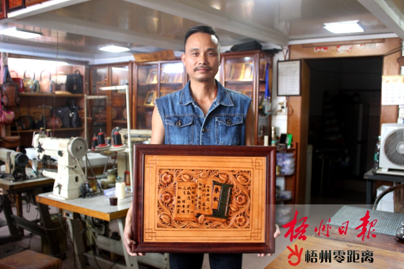 馮炳池享受制作皮雕的敲打時光。 拜師學藝升級技術求進步 自學皮雕技術,掌握了制作的基本技巧后,馮炳池并不滿足于此,他想著要升級自己的技術,精益求精。 于是,馮炳池多方打聽后,專門去深圳的專業皮雕培訓機構拜師學藝,跟隨日本雕刻老師小屋敷清一學習,得到了專業人士的悉心指導。 “小屋老師60多歲了,他雖然話不多,但是人很細心,每個步驟親手示范,手把手教學,使我的皮雕技術得到了很大的進步。”在培訓的時間里,馮炳池跟著專業人士學習到專業的手法,他完成了一個精巧的珠寶箱。這個皮雕作品跟自己以往自學制作的作品有很大的不同,“工藝和雕刻手法升級了。比如說打孔縫線,要通過手工一針一線地鋸縫,在厚一厘米的牛皮扎孔需要特別講究技巧,不然牛皮邊緣用錘打孔容易爆裂。” 經過系統的培訓,馮炳池制作皮雕的手藝越來越精湛了,每一件皮雕作品都融入他的匠心以及奇思妙想。 艱苦創作優秀作品終獲獎 皮雕作品《春秋·唐草》從畫圖、構思到修改、完工,前后花費了馮炳池1個月時間。馮炳池說:“《春秋》是中國古代儒家典籍‘六經’之一。‘唐草’是一種植物,即蔓生的草,由于它的形象靈動優美,又因盛行于唐代故名唐草紋,被廣泛地應用在木雕、石雕、衣飾等各種裝飾上。二者皆是中國傳統文化的重要組成部分。”為了更好地完成參賽作品,馮炳池反復閱讀《春秋》,搜索大量關于唐草的資料,精心挑選出合適的名言名句,最后,反復修改以便達到最滿意的成果。 功夫不負有心人,在2019年廣西工藝美術作品旅游工藝品暨大師精品展中,馮炳池的皮雕作品《春秋·唐草》脫穎而出,斬獲2019年廣西工藝美術品“八桂天工獎”銀獎。馮炳池認為這次獲獎意義重大,“讓我在皮雕創作的路上更加堅定信心,勇往直前。”
