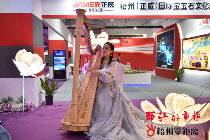 女樂手彈奏豎琴迎接賓客。 在旭平珠寶展位,復古面包車、鉆石型展柜備受關注;在黎蒙珠寶展位,五光十色串珠鏈也引得不少市民爭相搶購。“串珠鏈是市民喜愛的產品之一。”黎蒙珠寶的工作人員朱女士表示,這些串珠鏈屬于半成品,喜歡手工制作的市民可以利用這些串珠鏈進行創作設計,這也能讓市民親身體驗寶石加工的樂趣。