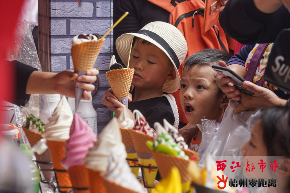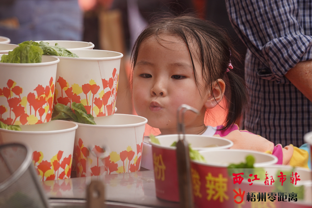 小朋友還沒拿到美食,已經迫不及待地先給美食吹氣降溫。 除了梧州本土美食受到熱捧外,各具風味的地方美食也受到食客的歡迎。圓滾滾的潮汕牛肉丸在大鐵鍋內翻滾;新鮮的湛江生蠔配上蒜蓉,在燒烤爐上“滋滋”地冒著熱氣;香港雞蛋仔一出爐就淋上甜蜜蜜的冰淇淋汁,“冰火搭配”引人駐足。 中午時分,美食嘉年華迎來了人流高峰,現場人頭攢動,不少攤位前都排起長龍,排隊等候的市民都“伸長脖子”,期盼地看著攤位上正在制作的美食。只見不少市民都與親朋好友一起逛美食展,他們或購買一大份美食共同享用,或各自買心儀的小吃回到座位互相分享,在享受美食的同時也感受濃濃的情誼。市民羅先生表示,今年的美食嘉年華令人驚喜,街區仿古裝飾很有嶺南風情,主辦方還細心設置了洗滌區、就餐區、垃圾投放區,令市民的用餐體驗更好。 文字:梧州零距離網-西江都市報記者 陳雨燕 攝影:梧州零距離網-西江都市報記者 楊 揚 |