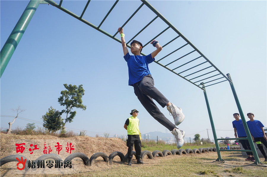 三人武裝越野比賽中,選手一氣呵成爬過(guò)雙杠。 (本版圖片由本報(bào)記者 楊揚(yáng) 攝) |