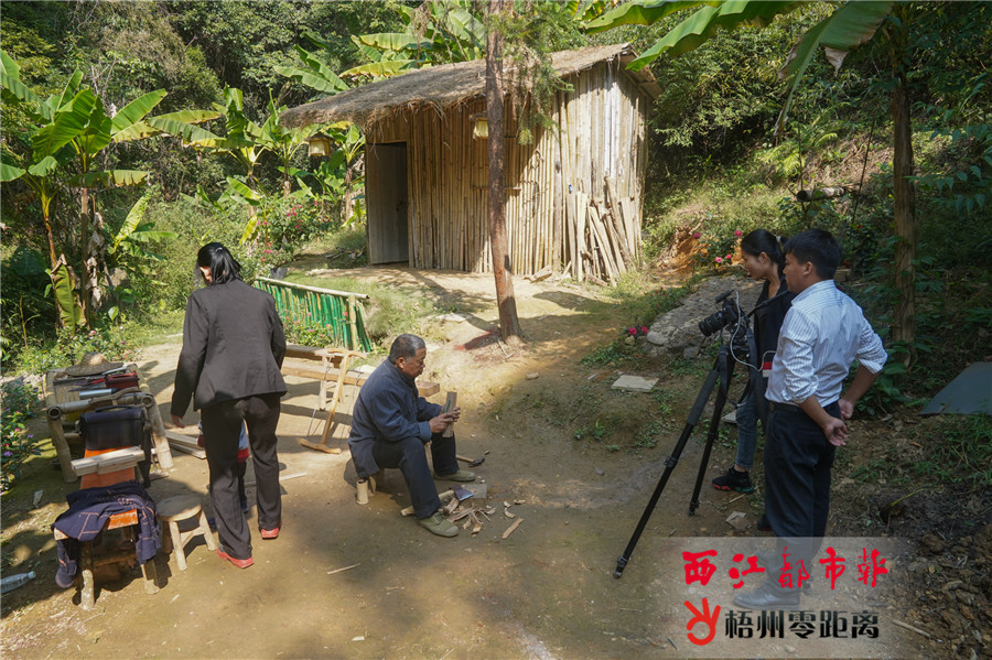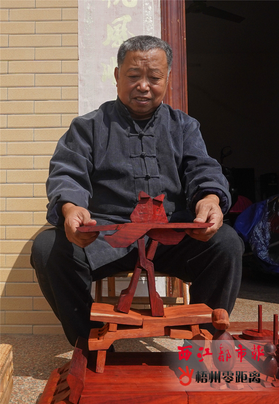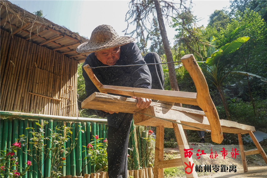 梧州零距離-西江都市報記者 蒙敏瑩 11月8日12時左右,在蒙山縣陳塘鎮(zhèn)幽靜山林深處,鋸木的沙沙聲與潺潺的小溪流水聲相互交融。簡陋竹茅房前,月季花、杜鵑花開得正盛,一名頭戴斗笠身著樸素唐裝老人正一腳踩在地上,一腳踩著固定木材的繩索,鋸子、鑿子、磨砂紙、斧頭在他手中交替運用,一切都得心應(yīng)手。