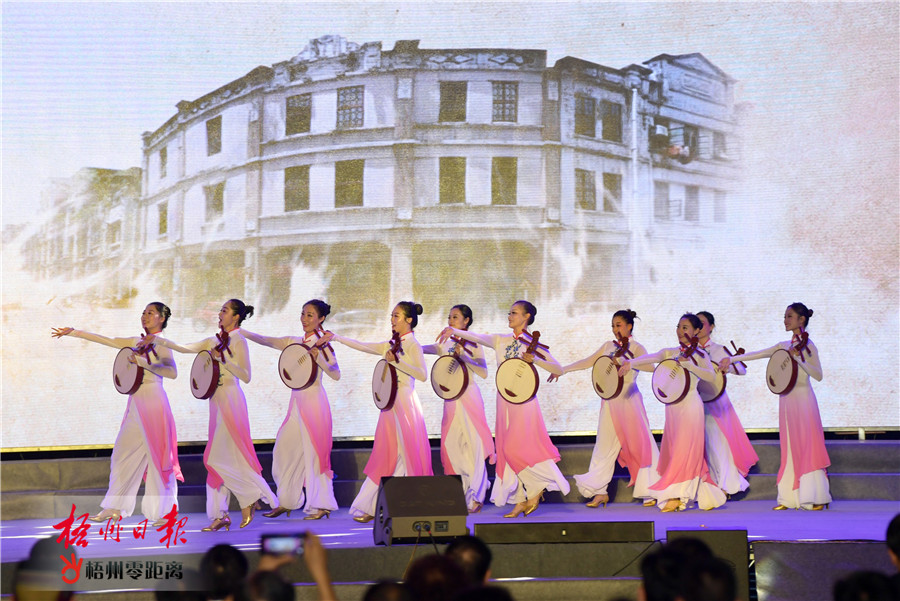 11月12日晚,在市政廣場,演員們表演粵劇舞蹈節目《騎樓情韻》。蒙紹松 攝 開幕式展演上,二度梅花獎獲得者歐凱明、廣東粵劇名家李嘉宜、粵劇骨子腔創始人黎佩儀、廣西梅花獎得主梁素梅等一批粵劇名家名伶同臺獻藝,傾情演繹《胡風漢月兩牽情》《孔雀金裘》《目連救母》等多個優秀粵劇表演劇目,來自市演藝有限責任公司、長洲區文化館等單位的演藝人員精心創排《南粵雄風》《騎樓情韻》《八仙游梧州》等豐富多彩的節目,為現場群眾獻上了一場粵劇視聽盛宴,博得陣陣熱烈的掌聲。演出尾聲,全體演職人員和觀眾起立高唱《我和我的祖國》,將晚會推向高潮。