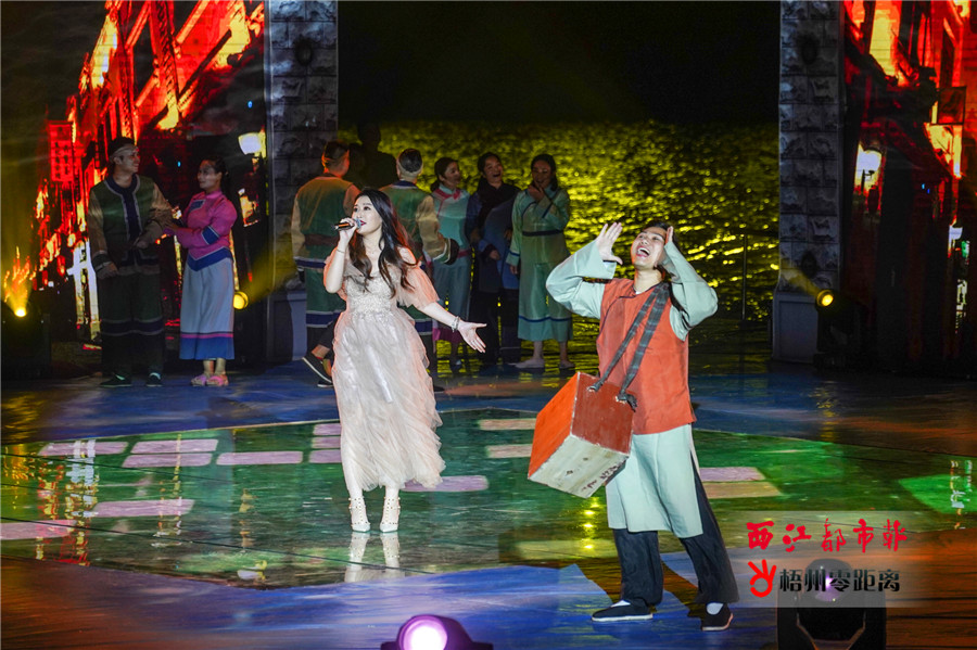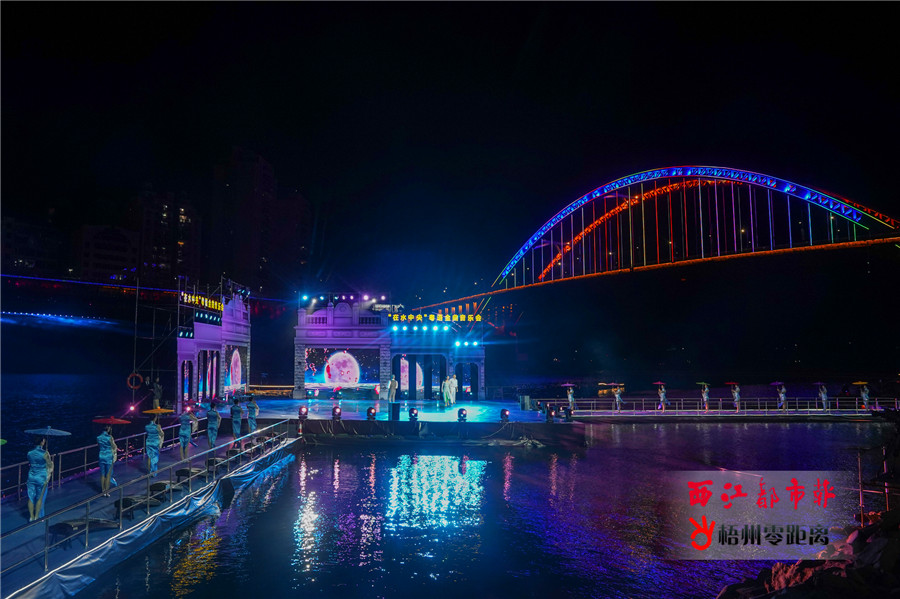 11月13日晚,演員們在江面舞臺表演粵語歌舞節目。蒙紹松 攝 水上舞臺以寶石形狀為設計元素,在“553311”市區文旅精品中的四座山環抱下,毗鄰梧州騎樓城,宛如一顆耀眼的寶石鑲嵌在江面,熠熠生輝。江水、堤岸、建筑、橋梁伴隨變幻跳躍的音樂和五光十色的燈光,共同組成一幅“鴛鴦秀水世無雙”的瑰麗畫卷。音樂會分為《鴛鴦秀水、千年古城》,《風雨騎樓、百年商埠》,《海納百川、力爭上游》三個篇章,從梧州是粵語和嶺南文化發祥地之一、騎樓城孕育了梧州百年商埠的歷史文化、新時代梧州加快“東融”開放發展等多個角度,通過一首首優美動聽的粵語金曲,仿佛讓人穿越時空,體味千年古城的秀美無雙。