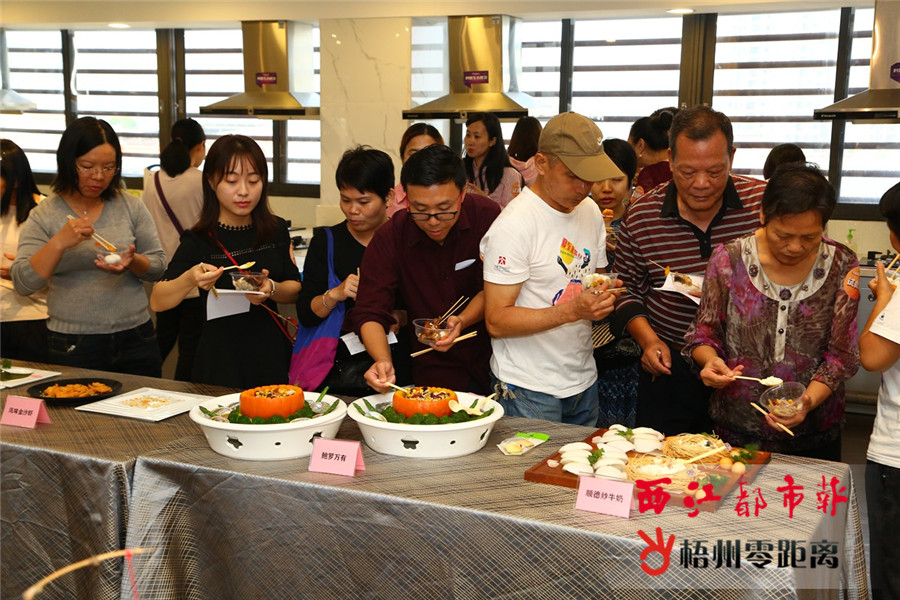 “試吃團”成員在品嘗參賽菜品。 在美食擂臺賽現場,20名“試食團”成員應邀到場觀賽并品味美食。“試食團”成員劉女士和她的女兒不僅品嘗了參賽的所有菜品,還全程觀看了廚師們的一系列工作,現場“偷師”,“我們對做菜火候把握、刀工、擺盤等操作都有了更深一層地了解”。 經過一番激烈比拼,珍寶精英隊憑借菜式“清油潑海豹蛇”獲得順德站擂臺賽冠軍,并將代表順德出征嶺南花樣廚神擂臺賽總決賽。香江德勝戰隊憑借菜式“古法煎鱔拼串燒鱔”獲亞軍,花樣飛躍隊憑借菜式“鮑羅萬有”獲季軍。據悉,嶺南花樣廚神擂臺賽總決賽于11月18日至19日在梧州舉行,屆時廣西、廣東、海南三省(區)民間廚藝高手將匯聚一堂,切磋廚藝。(黃錦棠) (本組圖片由佛山市順德區倫教飲食協會提供) |