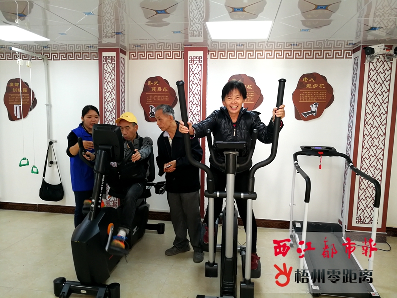 梧州零距離-西江都市報訊(記者 吳艷虹 通訊員 葉少斌)11月21日,萬秀區(qū)富祥社區(qū)居家養(yǎng)老服務(wù)中心舉行揭牌儀式,這是梧州市首家以“醫(yī)養(yǎng)娛融合”模式打造的社區(qū)居家養(yǎng)老服務(wù)中心,該中心打造“互聯(lián)網(wǎng)+養(yǎng)老”體驗新模式,讓長者足不出社區(qū)就能享受到就餐、娛樂、醫(yī)療、健身等一站式養(yǎng)老服務(wù)。 富祥社區(qū)居家養(yǎng)老服務(wù)中心位于原炭素廠小區(qū)8棟地層富祥社區(qū)旁,由萬秀區(qū)民政局負責(zé)建設(shè),占地面積約620平方米,由萬秀區(qū)云家庭服務(wù)中心、富民街道辦事處、富祥社區(qū)公共服務(wù)中心和第三方服務(wù)機構(gòu)聯(lián)合運營。記者看到,中心A區(qū)設(shè)置有老年食堂、老年大學(xué)、KTV、創(chuàng)作區(qū)、社區(qū)衛(wèi)生室等,B區(qū)設(shè)置有兒童之家、閱覽區(qū)、作品展示區(qū)、健身區(qū)、健康體驗中心、棋牌室等。健身區(qū)內(nèi)設(shè)置有臥式健身車、老人橢圓機、老人走步機等器械,不少長者在志愿者的引導(dǎo)下做健身活動。66歲的冼先生是一名健身愛好者,平時喜歡到珠山等處運動,他表示,該中心的建成讓他可以在家附近參與多種健身活動。