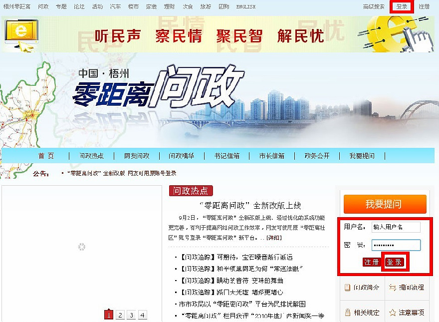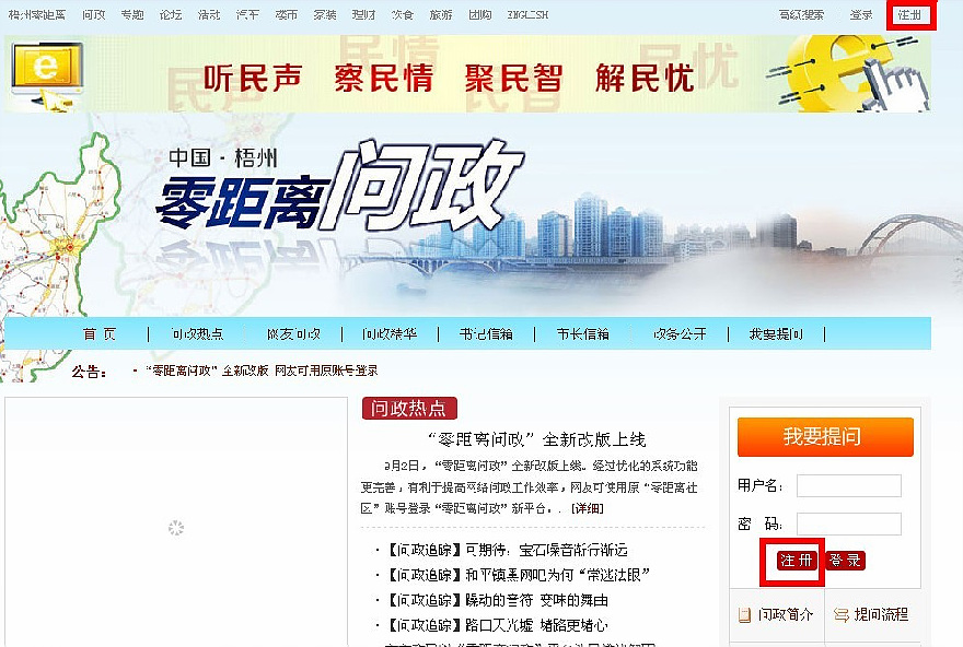 2、未注冊有賬號的網友,須先注冊用戶才可進行發帖問政。 (1)點擊首頁“注冊”用戶。