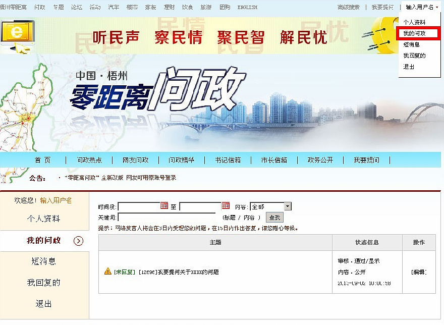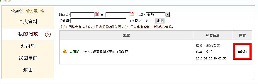 三、個人中心 修改“個人資料”、查看“我的問政”、“我回復的”以及發送站內“短消息”。 1、我的問政 (1)進入“我的問政”,可查看本人所發表的所有問政帖子,還可按時間段、關鍵詞搜索本人所發的帖子。