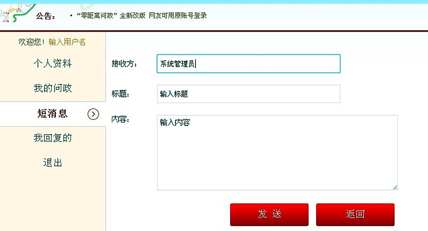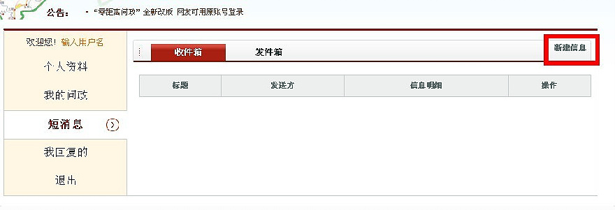 (2)點擊“新建信息”可發送站內短消息,輸入消息“接收方”、“標題”及“內容”發送,接收方可以是系統管理員、網絡發言人或網友。