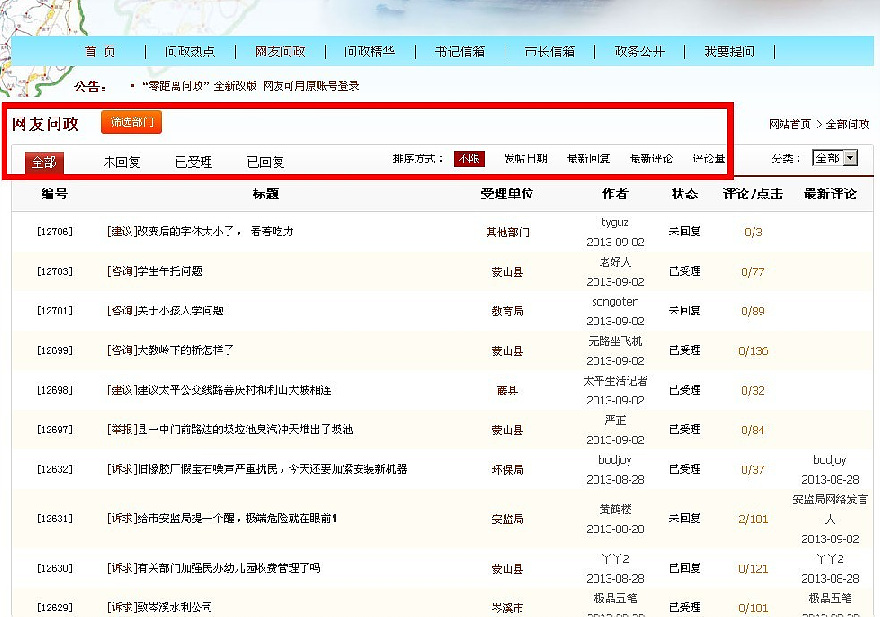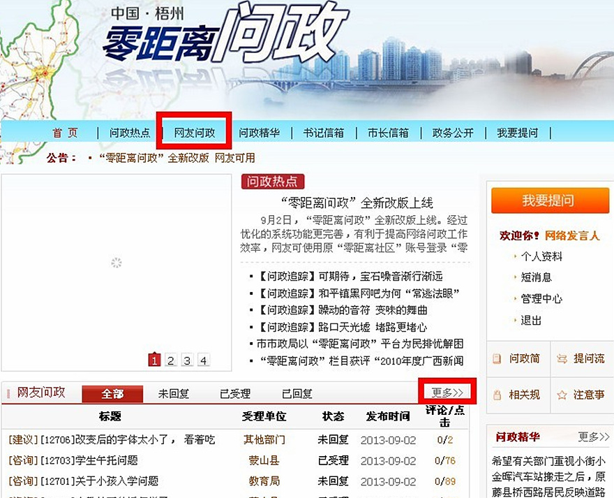 四、瀏覽及評論帖子 1、瀏覽“網友問政”帖子,可在首頁查看最新帖子,點擊進入“更多”或從導航中進入“網友問政”,可查看全部問政帖子。