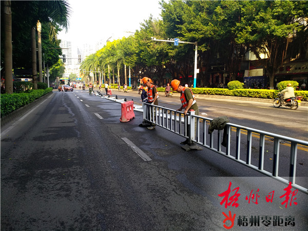 11月25日,在新興一路,工人正在重新調(diào)整道路隔離欄。