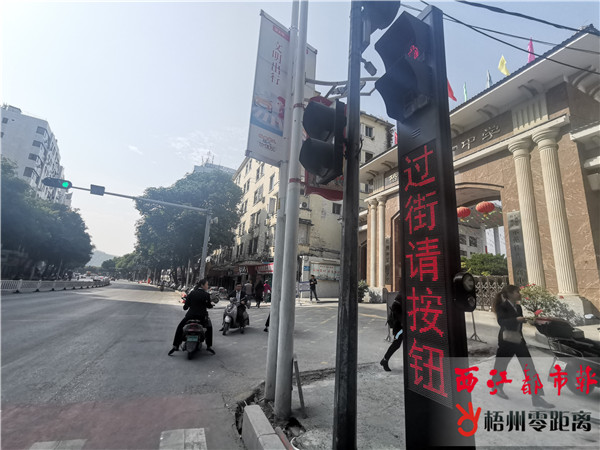 梧州零距離網(wǎng)-西江都市報(bào)訊(記者 陳雨燕 通訊員 石桂暉)需要過(guò)街?請(qǐng)按鈕!近日,不少經(jīng)過(guò)大學(xué)路與文瀾路的市民都發(fā)現(xiàn),梧州一中高中部及市第二實(shí)驗(yàn)小學(xué)斑馬線兩側(cè)新增了“行人過(guò)街按鈕”。行人按下按鈕后,控制系統(tǒng)將科學(xué)地調(diào)配及控制交通信號(hào)燈的燈時(shí),使行人過(guò)街更加安全方便。 “行人過(guò)街按鈕”獲市民好評(píng) 11月26日上午,記者在梧州一中高中部對(duì)出的斑馬線前看到,指引行人的交通信號(hào)燈一直亮紅燈,而信號(hào)燈下方有一處LED屏幕,寫(xiě)著“過(guò)街請(qǐng)按鈕”的提示詞。在LED屏幕的側(cè)邊,有一處帶綠色指引箭號(hào)的按鈕,準(zhǔn)備過(guò)斑馬線的市民李先生上前按動(dòng)該按鈕后,10秒左右,行人交通信號(hào)燈變綠,行人約有18秒的時(shí)間走過(guò)斑馬線。