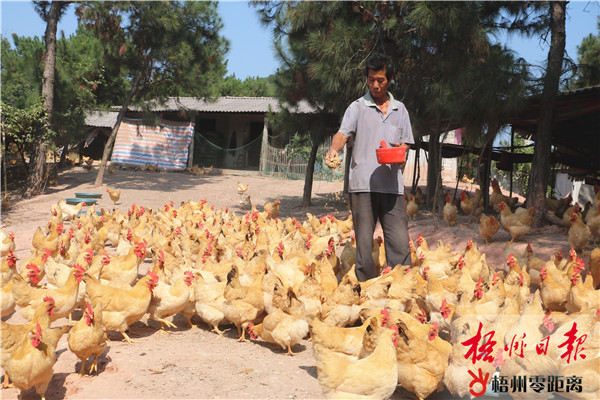 11月27日,藤縣天平鎮滿村一貧困戶在松林下給雞喂食。