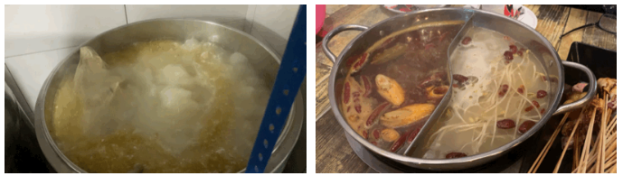 辣開有條路以牛骨熬煮底湯、牛油+中草藥炒制底料為特色。雪白的湯里以大塊牛骨吊鮮,牛骨上的牛油慢慢融化在湯里,整個后廚都充滿了牛油的香氣。麻辣鍋底的底料同樣講究,選用牛油炒制,但為了照顧梧州人的胃,婷婷和先生在鍋底里加入藿香等中草藥,中和了鍋底的大麻大辣,使食客在放肆吃辣后不容易腹瀉,同時也提升了整個鍋底的香氣。