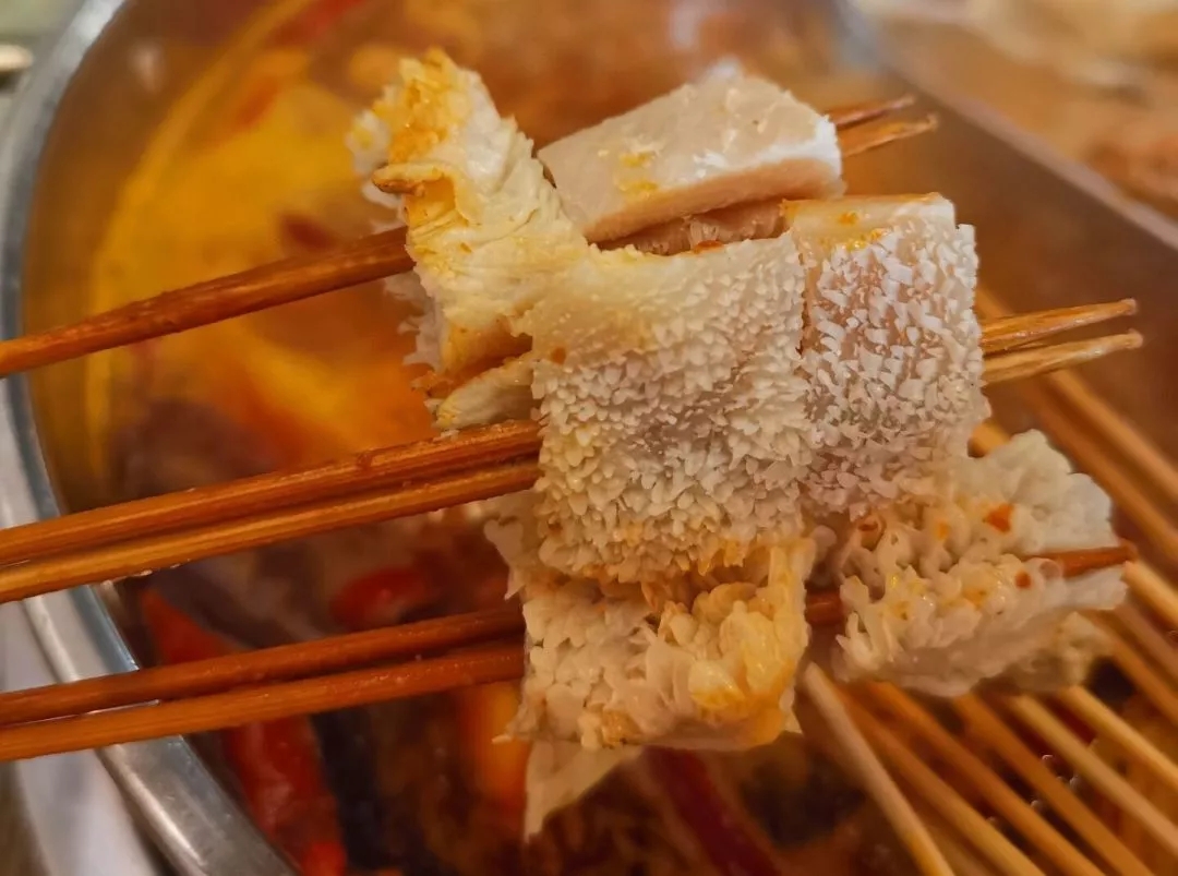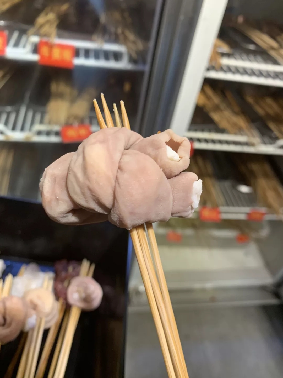 這是食俠和小伙“胖”們到店必取的菜品。來到店里,先拿3大把掌中寶是每次不變的“規(guī)矩”!掌中寶是雞的大腿中間那一塊軟骨黃色的部分,由脆骨和少量肉組成,在紅油湯里滾熟,讓脂肪吸飽了麻辣的味道,再趁熱放進(jìn)香油里轉(zhuǎn)一圈,爽辣鮮嫩! 2 肥腸結(jié)