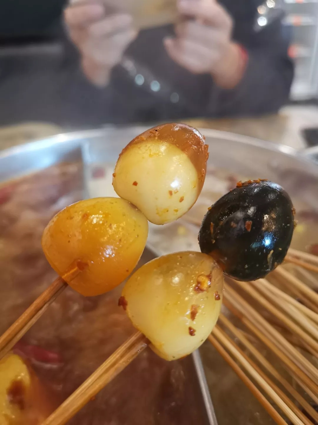 說實話,婷婷叫食俠試試這個的時候,食俠的內(nèi)心是拒絕的。看著這個粉紅色的中間填充了白色脂肪的腸結(jié),食俠和小伙伴都認(rèn)為它是腥而膩的。但婷婷先生告訴食俠,他們的肥腸結(jié)選用的是牛腸的其中一節(jié),與豬腸的口感完全不同。紅油湯底煮熟的肥腸結(jié)可以咬斷,中間的脂肪帶著牛油的獨特香氣,整個腸結(jié)處理得非常干凈,沒有腥臭味。而清湯鍋底煮熟的肥腸可以吃到牛雜的原味,連吃3個也不會覺得膩。 3 鵪鶉小皮蛋