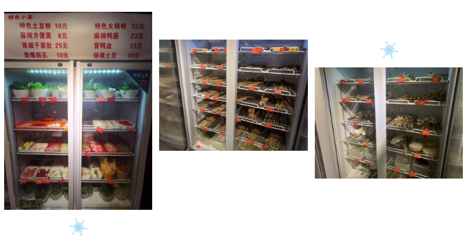 從店里的展示柜里可以看到,串串的品種很多,從海里游的魚、蝦、扇貝,到地上跑的雞肉、掌中寶、排骨、牛肉等,還有火鍋標(biāo)配的炸腐竹、油豆腐、豆皮等。數(shù)十種菜品都被細(xì)心地切成小塊,用竹簽穿成串。為了滿足更多食客的需求,婷婷開發(fā)了不少新菜式。如單牛肉就分好幾種口味:孜然牛肉、麻辣牛肉、香菜牛肉等等。當(dāng)把這些串串齊刷刷地放入沸騰的紅油鍋中,看著各式肉肉在鮮紅的湯料中翻滾,騰騰升起的熱氣和街外的寒風(fēng)落葉成鮮明的對比,這畫面怎么看都讓人心情愉悅。 1 掌中寶