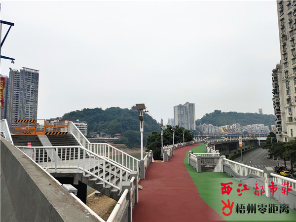 梧州零距離網-西江都市報訊(記者 蒙敏瑩)近日,有市民向本報反映,河東防洪堤桂江段堤頂道路封閉施工已有一段時間,一些喜歡在堤頂路休閑散步的群眾都期盼工程盡快完工、道路重新開放。記者向梧州市城建投資發展集團有限公司了解到,目前,施工方在確保防洪堤結構安全的情況下有序施工,預計工程12月下旬完工。 11月27日上午,記者來到河東防洪堤桂江段走訪,在走訪過程中,記者發現桂江一路鴛江大橋河東橋頭至桂林路龍母廟路段,以及通往河東防洪堤桂江段堤頂的所有通道均設置有相應的施工標志及護欄,市民無法進入堤頂。另外,在鴛江大橋北側人行道與河東防洪堤桂江段堤頂交匯處同樣設置有護欄。而在鴛江大橋及桂林路龍母廟附近地勢較高的路段,記者看到堤頂路面已被粉刷成紅色和綠色兩種顏色。