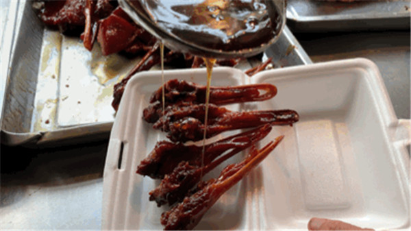 店老板從早上8點(diǎn)就開始腌制雞翅、鴨翅和鴨下巴,足足8個(gè)小時(shí),直到下午4點(diǎn),才將他們放進(jìn)烤爐里大火炙烤,而整個(gè)烤制過程足足需要一個(gè)多小時(shí)。長(zhǎng)時(shí)間的等待和準(zhǔn)備,只為給街坊們呈上最味美的燒鹵。 奇味燒鴨