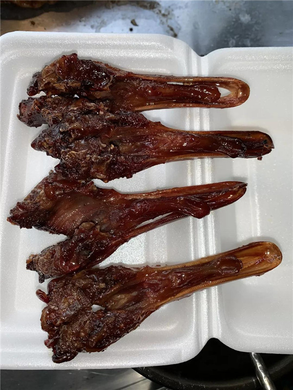 奇味也用鴨下巴做出了顛覆印象的美食,與印象中的下酒菜不一樣,這里的鴨下巴竟然是甜的。鴨下巴在燒干后趁熱取出,對(duì)半切開,再澆上特制的麥芽糖蜜汁。鴨下巴呈現(xiàn)紅亮的光澤,和蜜汁一起在陽光下閃閃發(fā)亮。這樣的鴨下巴甜香美味,吃一口就停不下來。