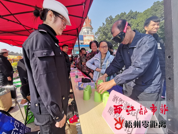 梧州零距離網-西江都市報訊(記者 陳雨燕 通訊員 石桂暉)今年12月2日是第八個全國交通安全日。當天,梧州市公安局、市網信辦、市文明辦等部門在鴛江麗港廣場聯合舉辦梧州市2019年全國交通安全日主題宣傳活動。相關職能部門通過派發文明交通宣傳單、設置酒駕醉駕模擬體驗點等方式,提升交通參與者的文明安全意識。