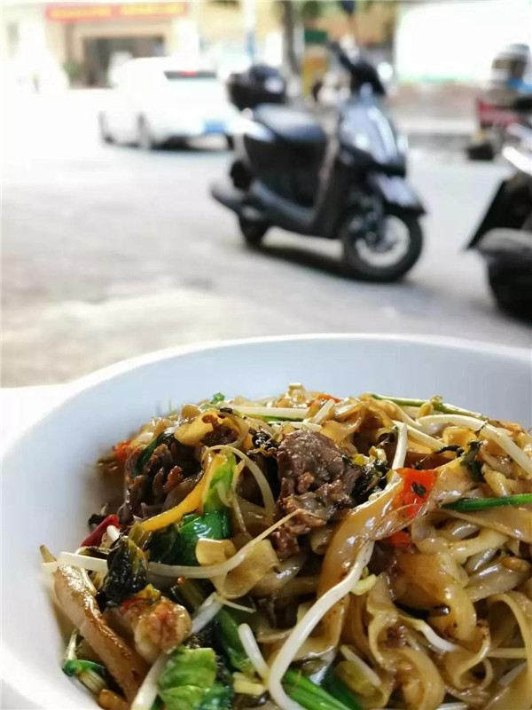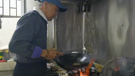 食俠站在門外都能看到沖天的火光。 我們知道,要成為一名武林高手,光有神兵利器是不夠的,屠龍刀再好,沒有刀法口訣,估計也只能用來劈柴;而鑊頭質量再好,沒有好的烹飪手法,也炒不出一碟好吃的河粉。而廖叔炒粉時有兩個口訣:“拋字訣”與“拖字訣”。 只見灶臺前火光沖天,廖叔將鑊頭一顛,整團炒粉猶如一塊金色印度飛餅一樣,被拋飛到半空中,又重重地摔回鍋里;還沒來得及反應過來,廖叔已經施展“拖字訣”,用鏟子“唰唰”幾下往周圍拖幾下,將結成一團的“粉餅”,均勻推開至整個鑊底。 “鑊頭夠大,可以讓粉均勻的鋪滿鍋底,粉條分開,受熱均勻,才可以讓配菜的味道與粉條充分融合在一起,所以吃起來每一口都特別美味!”廖叔得意地解釋道。 最后,廖叔在粉中加上一把咸酸菜碎炒幾下,只用了30秒,一盤讓無數食客口水直流三千尺的炒牛河就端了上來。