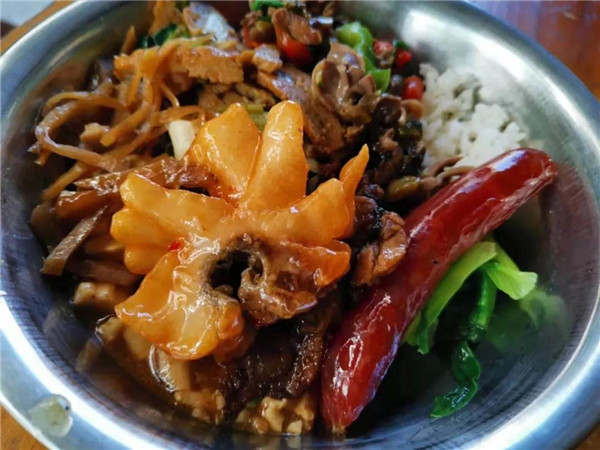 黃姨在給客人舀菜。 食俠最喜歡吃的是廖叔和黃姨親手做的臘腸,菊花魚,和甜酸椒釀,味道醇正,滋味十足。隔壁桌小孩一直吵著要吃包了肉末的煎蛋,食俠眼睜睜地看著他一口氣就吃了3個。