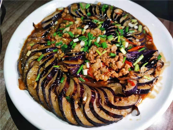 盤龍茄子 盤龍茄子一上來,精致的造型和勻稱的刀工就讓整碟茄子鍍上了一層“高級感”的濾鏡,茄子被切成背斷而腹不斷的造型,呈“臥龍”之姿盤于圓碟之上,淋上一勺肉末,油水與茄子共融,肉香與油香在口腔齊飛,這真真是茄子界的“愛馬仕”。