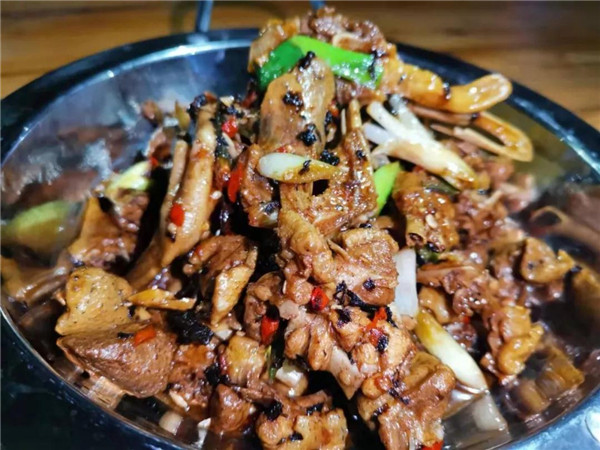 干鍋野鴨 “我們選用的不是普通的鴨子,是野鴨子,個頭不大,口感柔韌卻不難咬。”贛味館的李老板告訴刺猬姐。李老板是正兒八經的江西人,為了能隨時隨地吃辣,就開了這家餐館。選料的用心造就了菜品的非凡口感,從鴨頭鴨脖可以看出與平時菜市賣到鴨不同,脖子細鴨頭硬,再用干鍋菜的制作方法制作,湯少味道足,既迎合了舌根與舌尖對麻辣并重的依賴,又能在品嘗完干鍋的同時享受火鍋的樂趣,兩者合一,美味加倍。