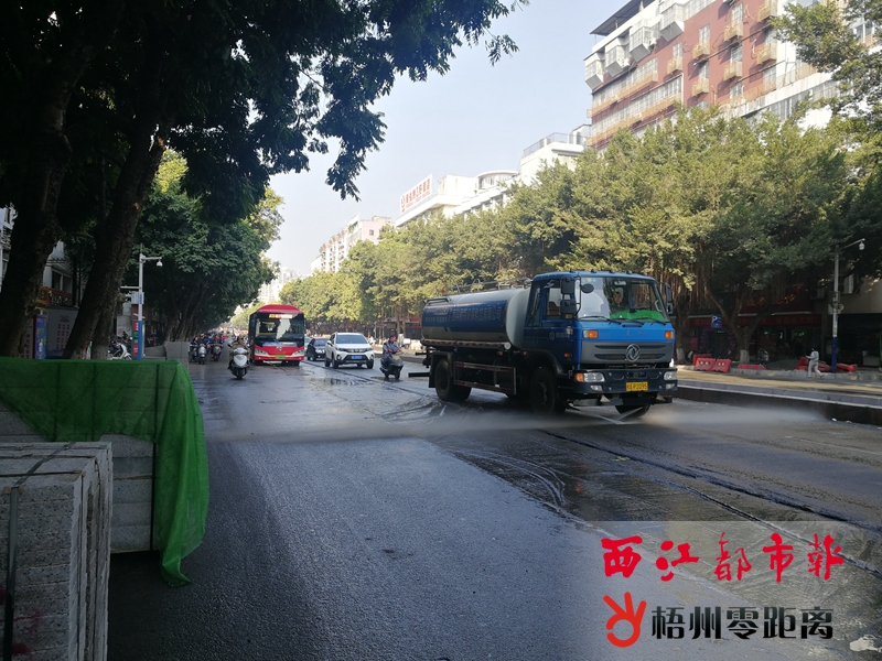 梧州零距離網(wǎng)-西江都市報(bào)訊(記者 吳艷虹)近期,市內(nèi)多條主干道的道路改造提升工程正在有序展開,但有讀者向本報(bào)反映,稱部分路段在進(jìn)行工程作業(yè)時(shí)產(chǎn)生揚(yáng)塵,加之近來(lái)天氣干燥,揚(yáng)起的灰塵四處飄散。對(duì)此,環(huán)衛(wèi)部門與道路改造提升工程建設(shè)單位均表示,已采取對(duì)路面進(jìn)行不間斷灑水等措施降低揚(yáng)塵。 讀者劉女士反映,她居住在新興市場(chǎng)旁,新興一、二路是上下班的必經(jīng)道路。“有時(shí)候路過施工路段時(shí),能看到施工作業(yè)產(chǎn)生較大的揚(yáng)塵,特別是切割磚塊的時(shí)候。”劉女士說(shuō)道。 12月12日,記者沿新興一、二路走訪,發(fā)現(xiàn)整條道路內(nèi)有多個(gè)作業(yè)面正同時(shí)開展施工。記者觀察發(fā)現(xiàn),沿路雖然有施工人員正在進(jìn)行磚塊切割、地磚鋪設(shè)、搗制水泥、綠化帶施工等作業(yè),但產(chǎn)生的揚(yáng)塵很少,且期間有灑水車密集地來(lái)回灑水,使路面保持濕潤(rùn)狀態(tài)。而在工廠路小學(xué)門前,路邊還擺放著一輛環(huán)保降塵霧炮機(jī)。