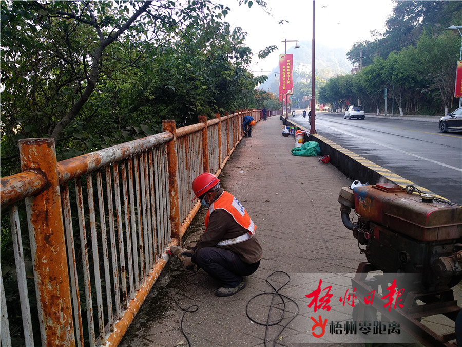 12月16日,在河?xùn)|防洪堤桂林路段沿岸,工人正打磨護欄并掃漆。據(jù)悉,桂林路段沿岸護欄修復(fù)工作是河?xùn)|防洪堤提升改造內(nèi)容之一。連日來,施工人員打磨護欄的舊色漆,重新噴上底漆,并修補缺損的護欄鋼枝。梧州零距離-梧州日報記者 李鴻榮攝